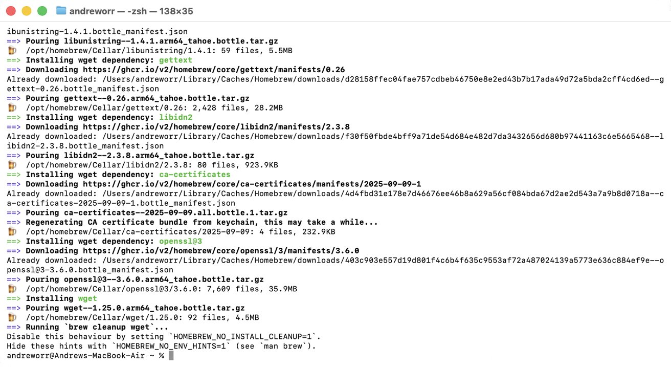 You type a short command — brew install followed by the name of the software — and Homebrew takes care of everything. It finds the package, checks it, installs it, and makes it available immediately.